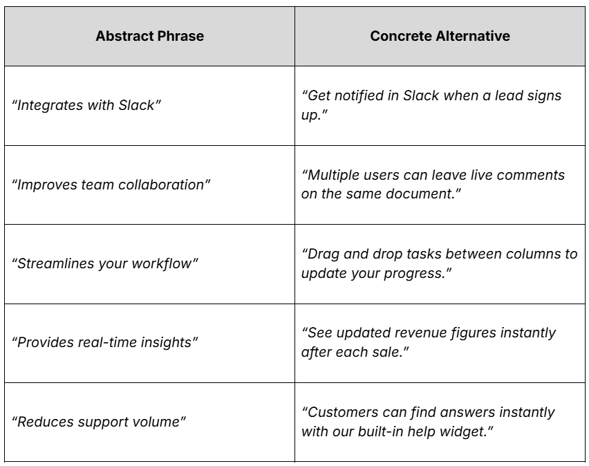 Concrete language doesn’t just explain – it demonstrates. It helps your reader visualise using the product, not just buying into an idea.